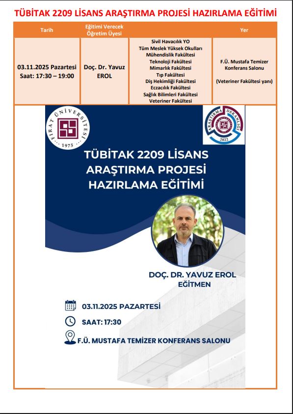 TÜBİTAK 2209 Lisans Araştırma Proje Başvuruları kapsamında düzenlenen eğitimlerin altıncısı ve sonuncusu 03 Kasım 2025 Pazartesi günü saat 17:30’da Mustafa Temizer Konferans Salonu’nda gerçekleştirilecektir.